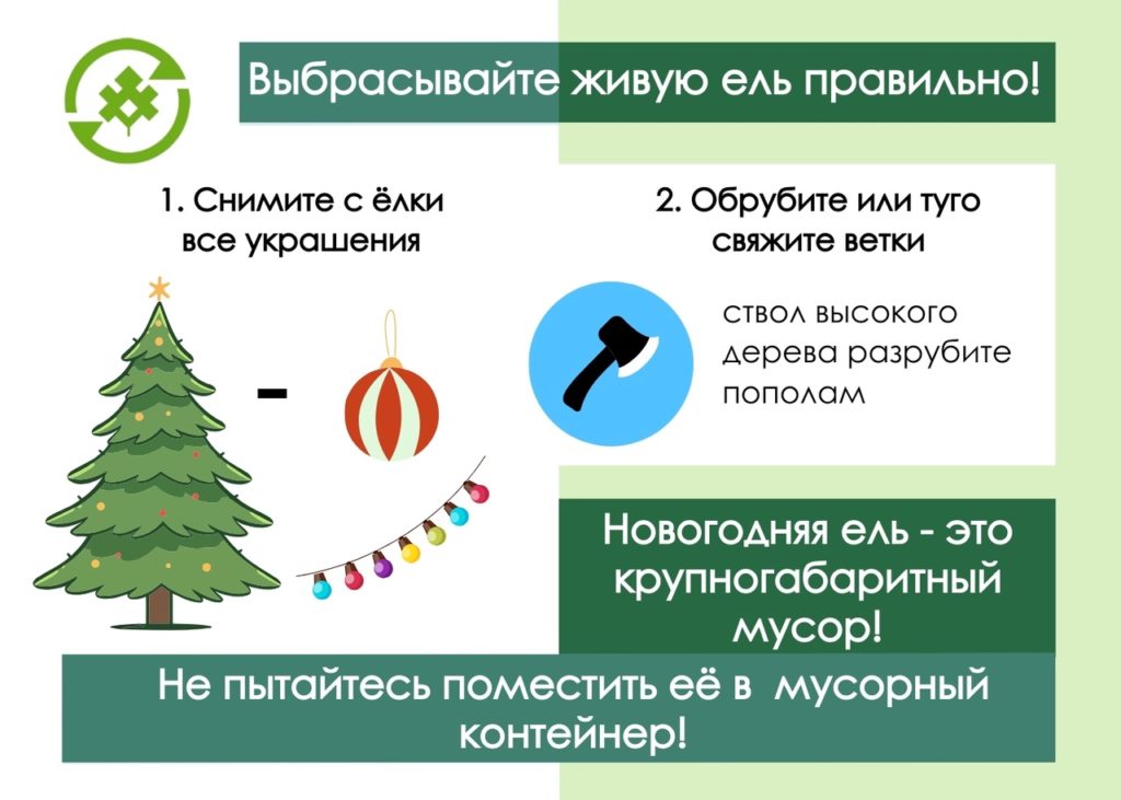 Не выбрасывайте ёлку в мусорный контейнер, поместите её в отделение для крупногабаритных отходов: аккуратно положите или поставьте так, чтобы не преграждать путь пешеходам и транспорту.