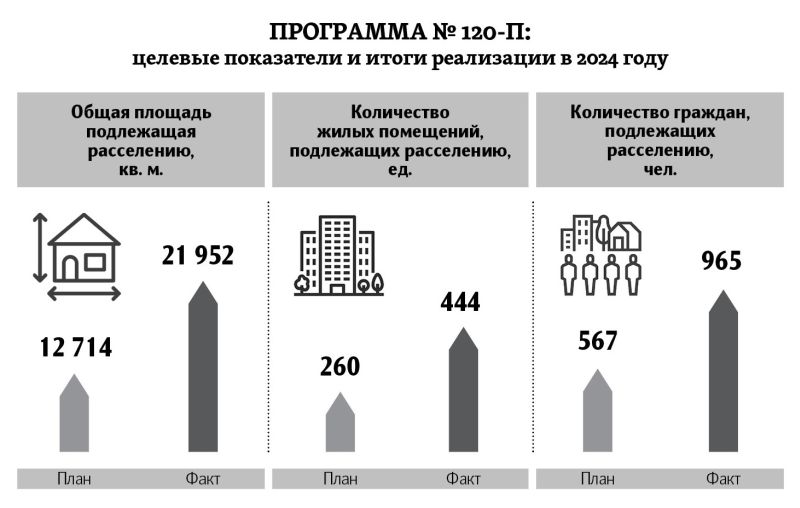 – По состоянию на 1 июня текущего года вышеуказанная программа была полностью завершена, – сообщил докладчик. – Тем самым своевременно и надлежащим образом исполнен соответствующий указ Президента Российской Федерации. Расселено 76 494 квадратных метра площадей, или 2 024 помещения, в которых проживало 5 024 человека.