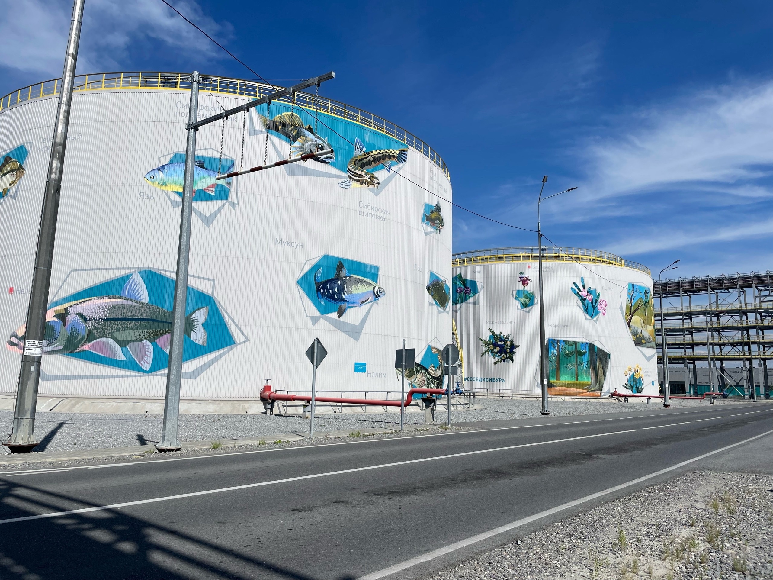 Уникальный арт-объект был создан в рамках проекта #ДобрыеСоседиСИБУРа. На 4 резервуарах изображены представители флоры и фауны. Такая роспись производственных сооружений- напоминание о том, что живая природа может гармонично соседствовать с промышленностью без негативных последствий. Напомним, данный комплекс является центром современной нефтехимии России, где ведётся переработка газа и нефти. Сырьевая база поставляется с ямальских и югорских месторождений. Компания сотрудничает с с Новатэком, Газпром нефтью и Газпром переработкой. Ещё одно предприятие, которое работает с фирмами Ямало-Ненецкого и Ханты-Мансийского автономными округами завод «Нефтемаш». Его тоже посетили журналисты. Основная деятельность – производство оборудования для технологических процессов в блочно-модульном исполнении для обустройства месторождений, а также для объектов добычи, транспортировки и переработки нефти и газа.
