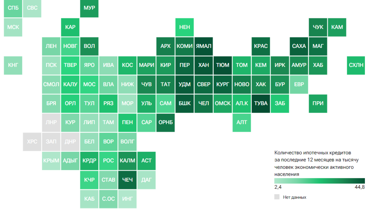 Лидером стала Тува. В республике выдача кредита выросла в 2,5 раза за год по сравнению с 2022 годом — 45 человек из тысячи взяли за 12 месяцев ипотеку. Второе место заняла Тюменская область. Там соотношение кредита и численности населения составило 37 человек из тысячи.