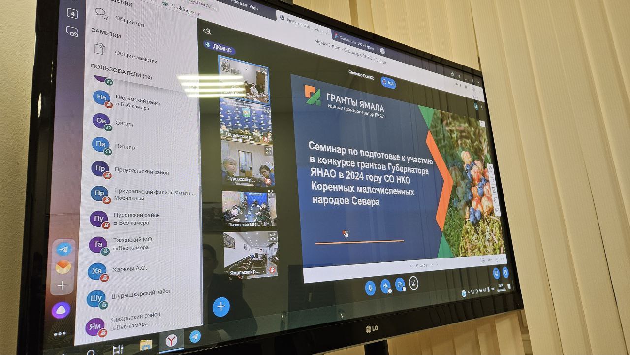 Прошел семинар по подготовке к участию в конкурсе грантов Губернатора ЯНАО в 2024 году СОНКО КМНС режиме видео-конференц-связи на базе Департамента по делам коренных малочисленных народов Севера Ямало-Ненецкого автономно