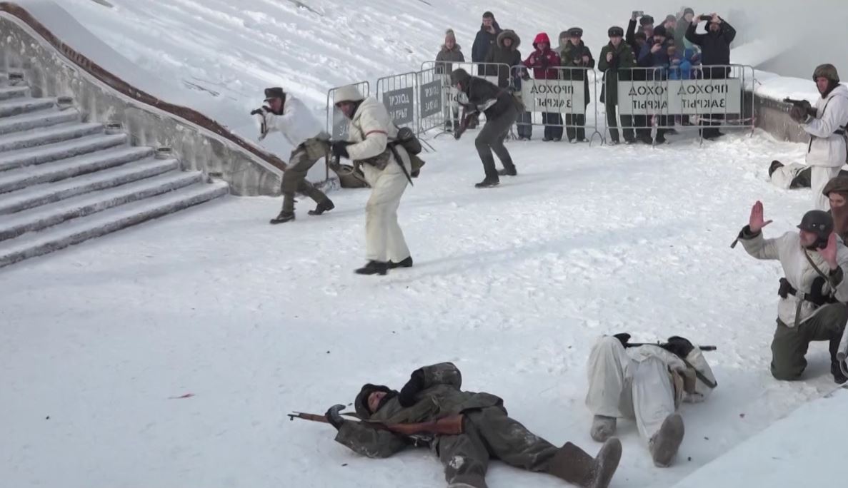 В Тюмени, на льду Туры, развернулась реконструкция одного из сражений битвы за Ленинград. Февраль 1944 года, блокада с города снята. Сейчас, по сценарию, бой идет под Старой Руссой. Солдаты 1-й ударной армии уже освободили Новгород и добивают остатки гитлеровцев.