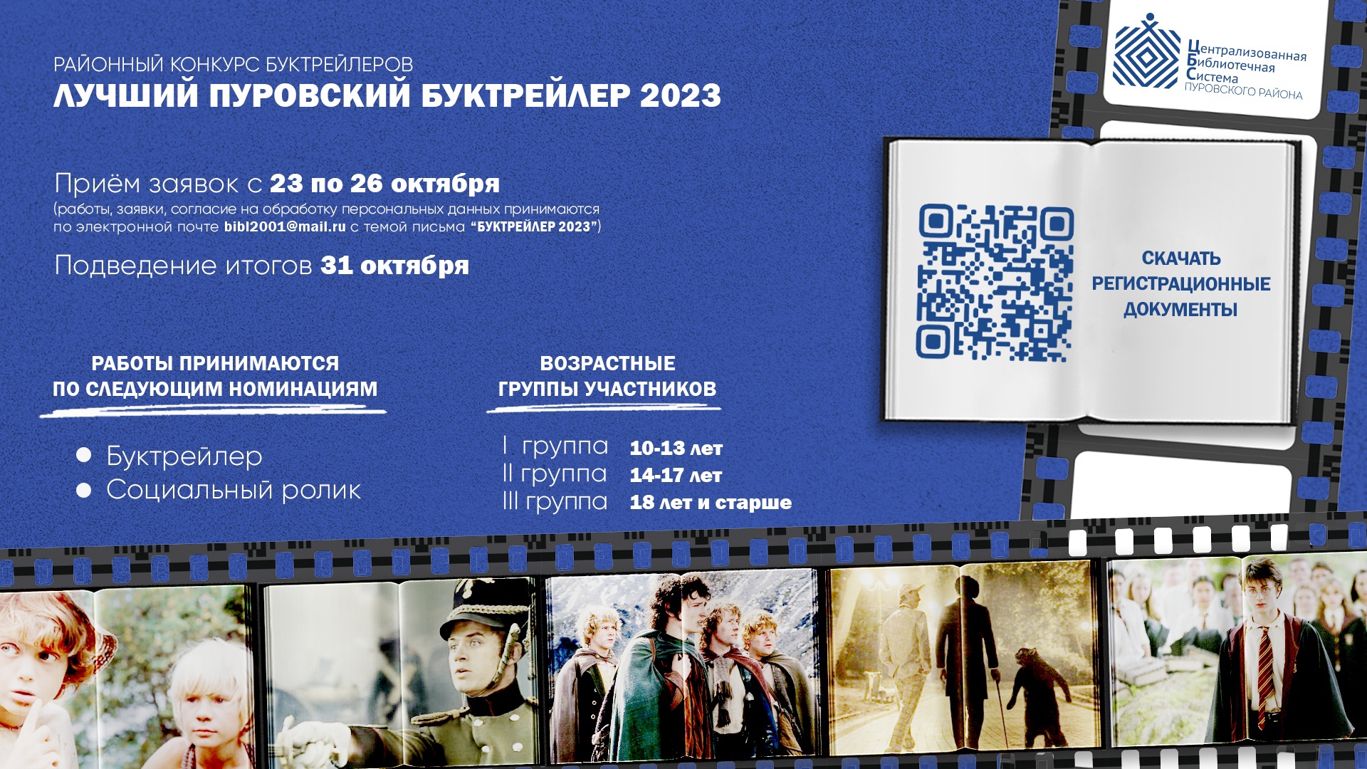 Стартовал приём заявок на конкурс "Лучший Пуровский буктрейлер 2023"Участникам конкурса через двухминутный видеоролик нужно презентовать книгу, рассказать о содержании и убедить ее прочесть или снять социальный ролик по продвижению чтения. Участникам конкурса через двухминутный видеоролик нужно презентовать книгу, рассказать о содержании и убедить ее прочесть или снять социальный ролик по продвижению чтения.