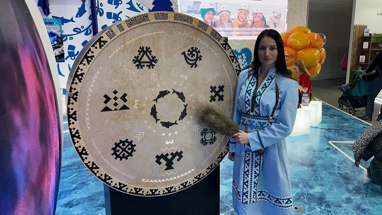 В праздничной инсталляции появились елки, олени, снежинки и коробки с подарками. Также на стенде установили интерактивный бубен диаметром 1,5 метра. Новый элемент украшен изображениями животных и национальными орнаментами. Ударяя по бубну специальной колотушкой, гости выставки смогут услышать звуки ямальской природы, горловое пение и национальные мотивы.