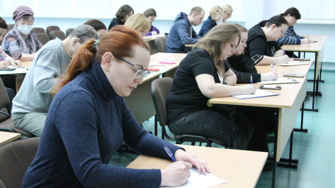 В актовом зале одного из корпусов колледжа профессиональных и информационных технологий царит тишина, изредка нарушаемая шелестом бумаги и шепотом. Горожане в возрасте от 16 лет готовятся к написанию Тотального диктанта.