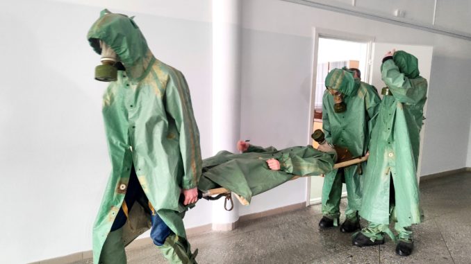 Не менее ярким эпизодом учебных сборов были занятия по радиационной, химической и биологической защите. По команде «Газы!» группе из пяти человек необходимо в кратчайшее время облачиться в общевойсковые защитные комплекты и противогазы, затем уложить условного раненого на носилки и всей группой добежать до медицинского пункта. Здесь у ребят новое испытание – определить вид травмы, признаки которой указаны в билете, четко ответить на вопрос экзаменатора, а затем всем вместе добраться до исходной точки. Задача группы — действовать быстро и слаженно, чтобы показать минимальное время.