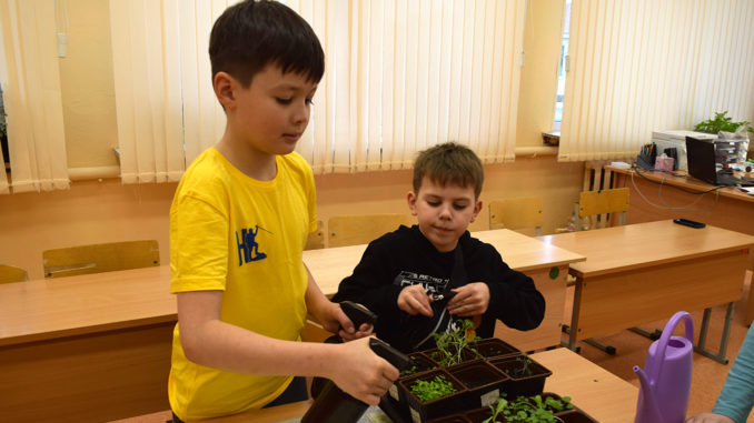 Дети высадили подготовленные семена в грунт, и уже через три дня появились первые всходы. Благодаря условиям, созданным в гроубоксах (специальных кабинетных теплицах), растения развиваются в полноценном микроклимате. Сегодня можно увидеть окрепшие ростки.