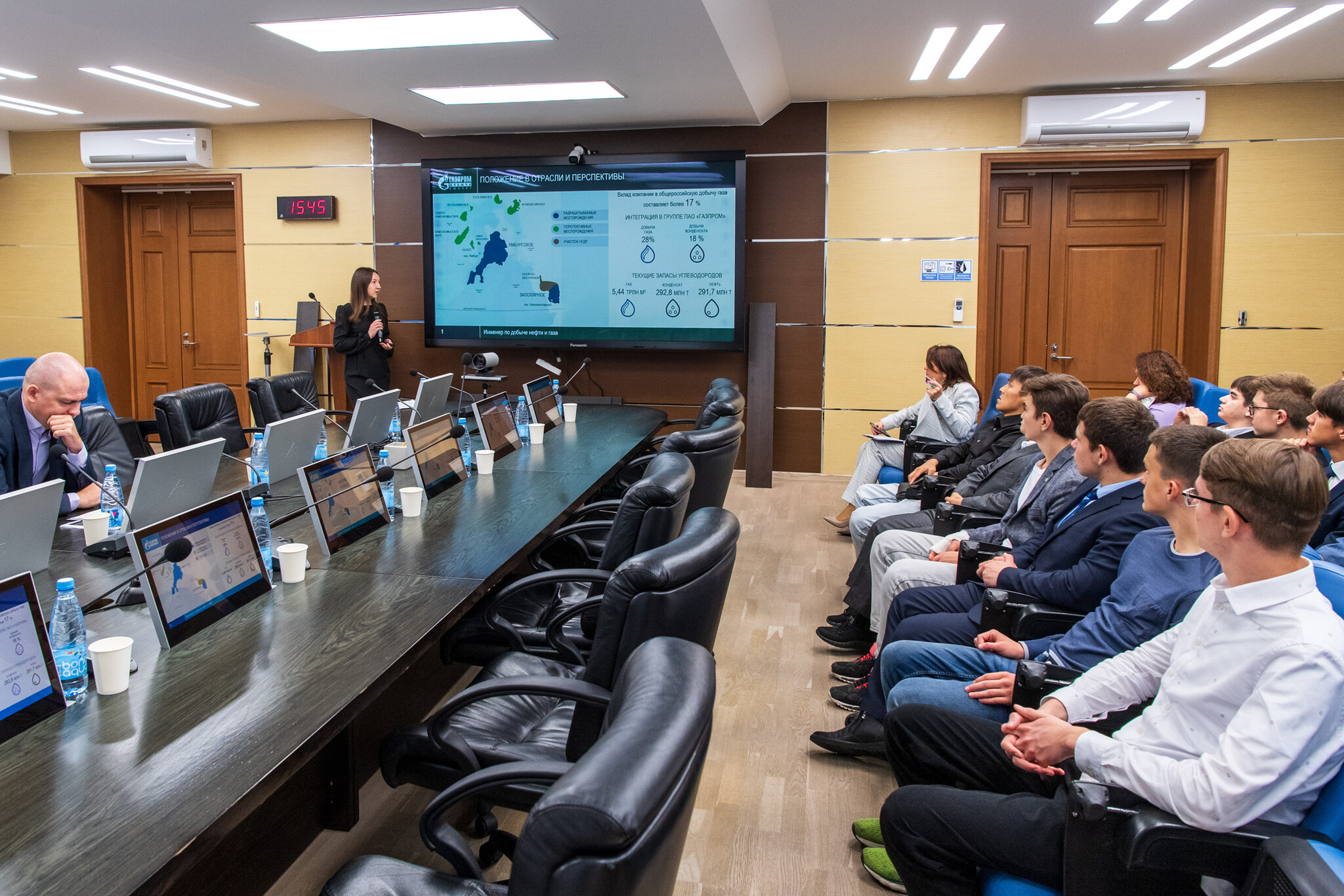 Перед школьниками выступили работники газодобывающего предприятия с презентацией пяти основных востребованных специальностей: инженер по добыче нефти и газа, инженер КИПиА, инженер-механик, инженер-энергетик и геолог. О деятельности Совета молодых ученых и специалистов рассказала председатель СМУС Анастасия Павлова.