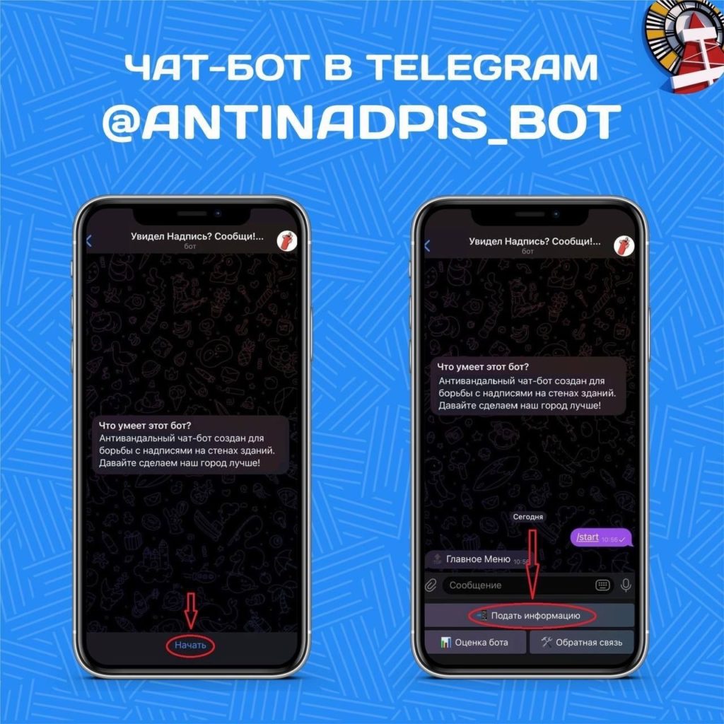 Ноябряне могут сообщить об этом в администрацию города при помощи чат-бота в Telegram. Он разработан сотрудниками отдела по вопросам общественной безопасности совместно с представителями «Киберщита» специально для того, чтобы бороться с надписями на зданиях.
