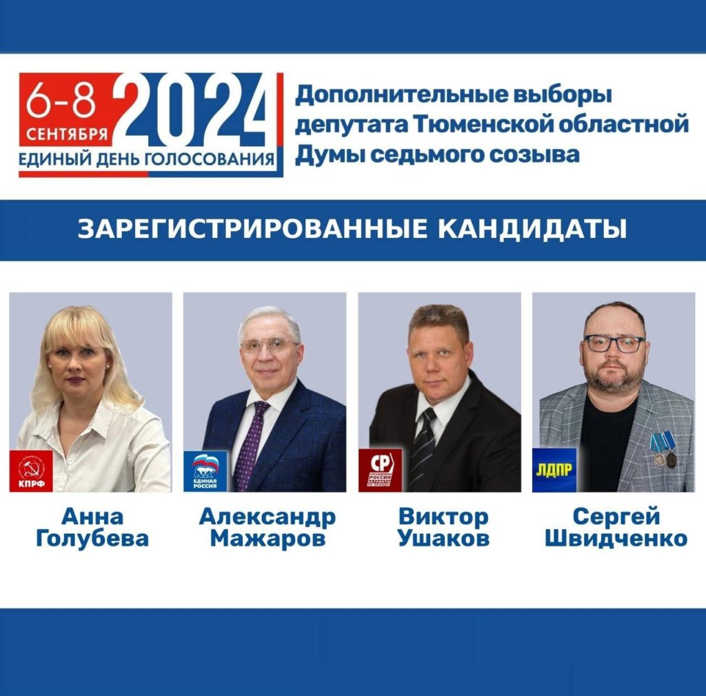 Анна Владимировна Голубева, выдвинутая тюменским областным отделением «КОММУНИСТИЧЕСКОЙ ПАРТИИ РОССИЙСКОЙ ФЕДЕРАЦИИ»; Александр Викторович Мажаров , выдвинутый тюменским региональным отделением партии «ЕДИНАЯ РОССИЯ»; Виктор Иванович Ушаков , выдвинутый региональным отделением партии «СПРАВЕДЛИВАЯ РОССИЯ – ПАТРИОТЫ – ЗА ПРАВДУ» в Тюменской области; Сергей Федорович Швидченко , выдвинутый тюменским региональным отделением Либерально-демократической партии России.С подробной информацией о зарегистрированных кандидатах можно ознакомиться на официальном сайте Избирательной комиссии ЯНАО.