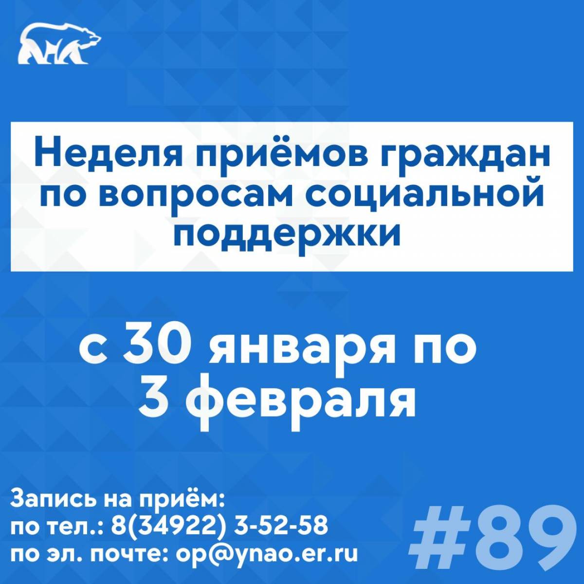 Напоминаем, записаться на приём необходимо заранее: с 23 января по 3 февраля включительно с 8:30 до 17:00 заявки принимаются по телефону региональной общественной приёмной партии «Единая Россия»: 8(34922) 3-52-58. Также обращение можно направить на электронную почту: [email protected]ynao.er.ru.