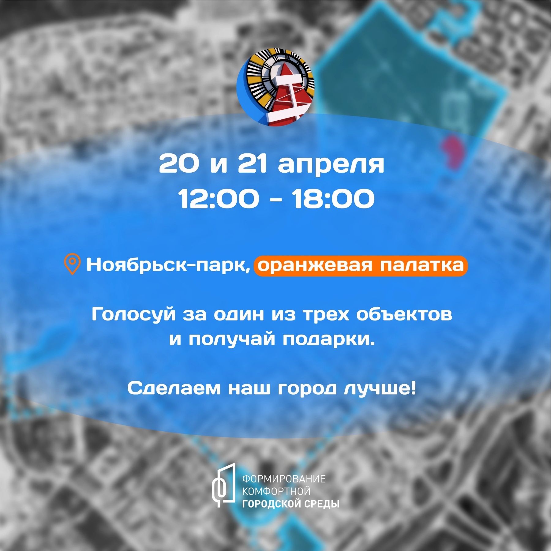 20 и 21 апреля с 12 до 18 часов нужно прийти в Ноябрьск-парк, найти оранжевую палатку и проголосовать за один из трех объектов, которые могут преобразиться уже в следующем году.