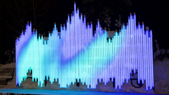 сияние» и использовал в работе фрагмент его партитуры. Из множества световых трубок он собрал своеобразный эквалайзер, по которому пустил световой волной главную музыку Ямала – северное сияние.