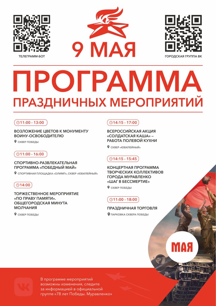 На спортивной площадке «Олимп» и в сквере Юбилейном будет организована спортивно-развлекательная программа «Победный май», также для горожан будет работать полевая кухня.