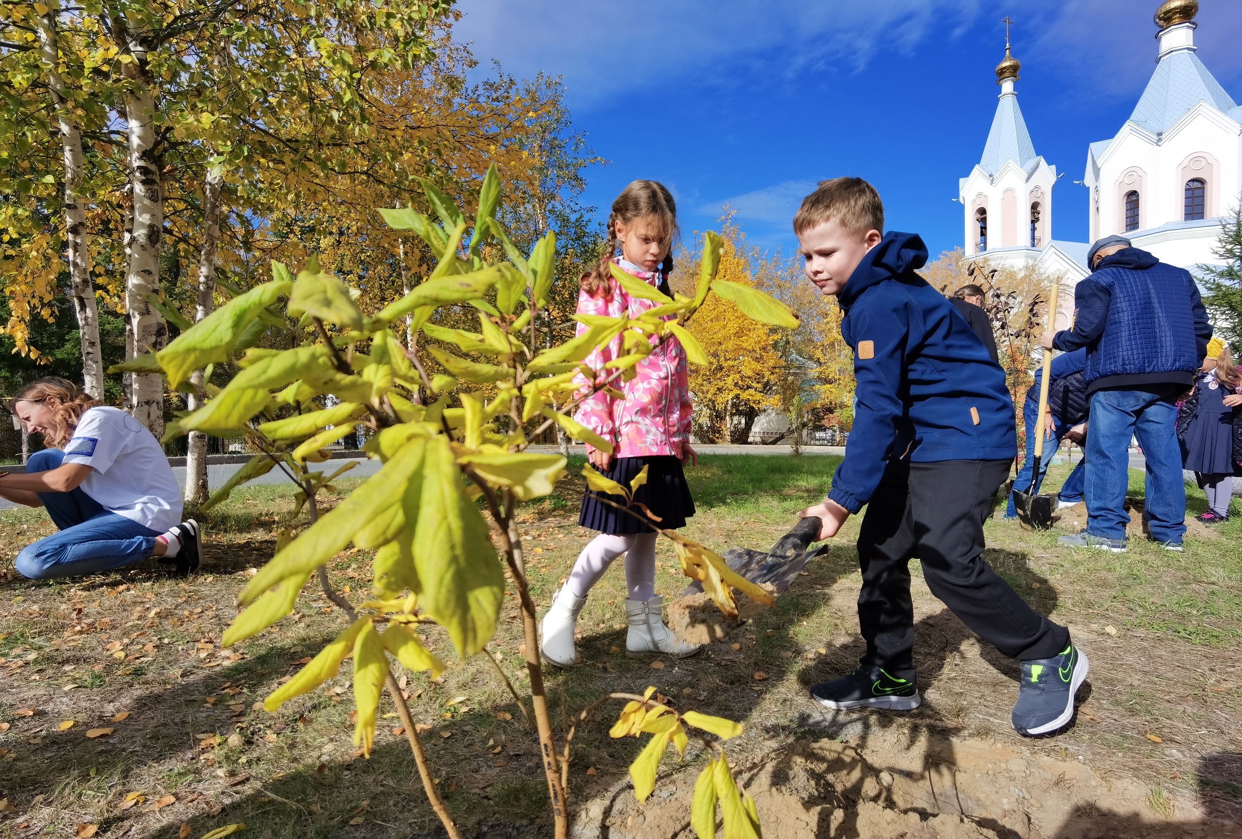 12 сентября на территории храма апостолов Петра и Павла воспитанники Салехардской Православной гимназии вместе с родителями высадили саженцы деревьев.