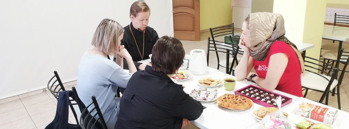 Первую встречу провел иерей Сергий Кузнецов, собеседники говорили о важности участия в богослужении и Таинстве Причастия. Родителей спрашивали священника о том, как правильно подготовить детей, как часто нужно причащаться, какие молитвы читать и в каком количестве, чтобы дети не утомлялись. Час за чаем пролетел незаметно, в конце, уже после своих занятий, к беседе присоединились дети.