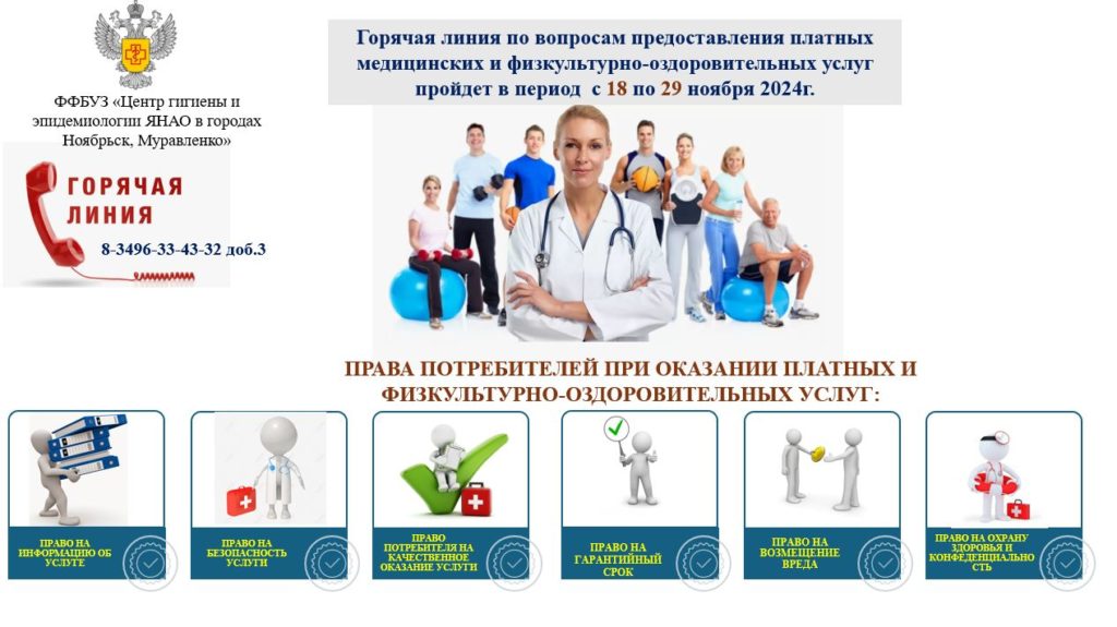 На базе филиала Центра гигиены и эпидемиологии в ЯНАО в Ноябрьске и Муравленко до 29 ноября работает горячая линия по защите прав потребителей при предоставлении платных медицинских и физкультурно-оздоровительных услуг. Консультации проводит юрисконсульт Дарья Бугрова.