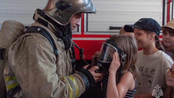 Для ребят, посещающих летнюю площадку при ФОК «Здоровье», экскурсоводами выступили пожарные, заступающие на боевое дежурство.