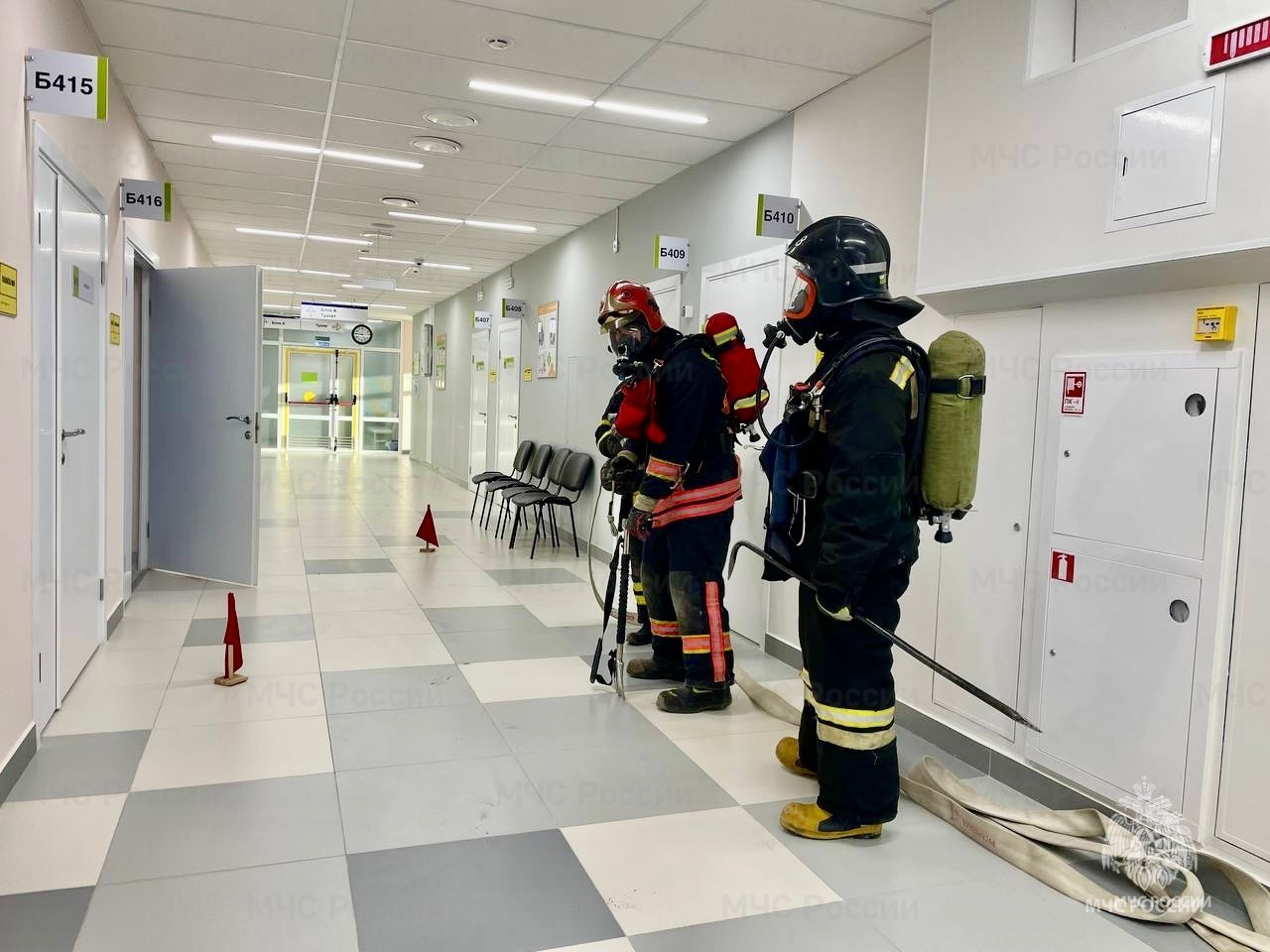 Тема учений - тушение пожаров на объектах здравоохранения. По тактическому замыслу тренировки в результате неисправности электрооборудования произошел пожар в медицинском кабинете.